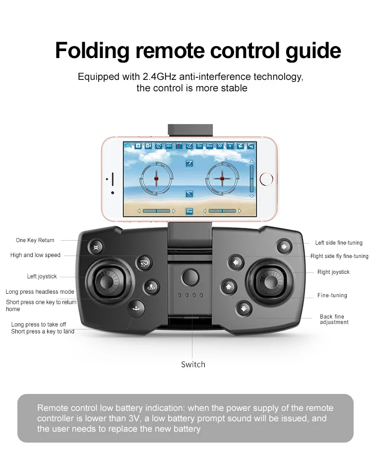 Описание Функции: вперед, назад, левая и правая сторона полета, три скорости, поворот на 360 градусов, Безголовый режим, возврат одной кнопкой, Аварийная остановка, WIFI мобильный телефон в режиме реального времени передача и контроль