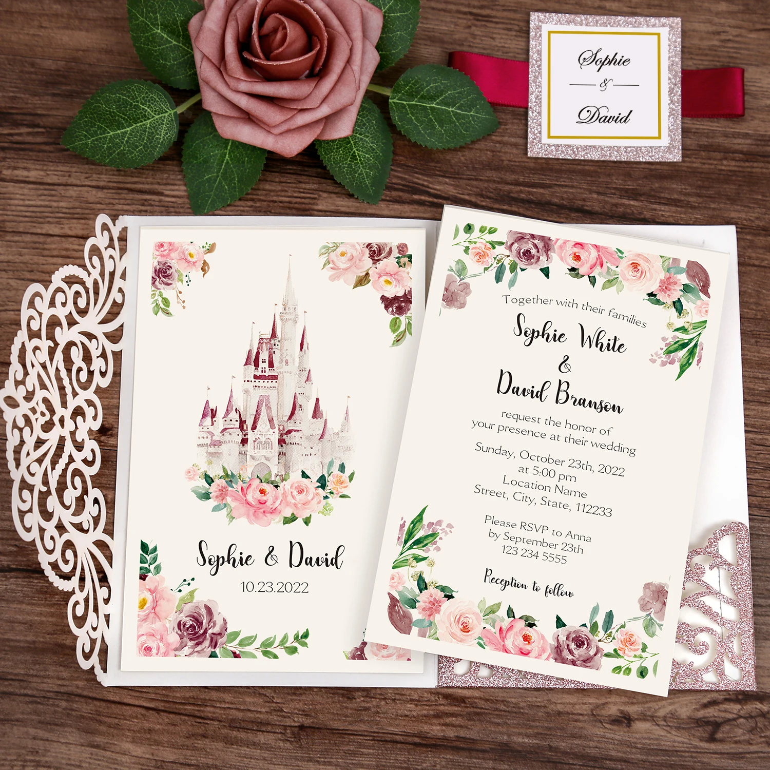 100 шт Заказные блестящие лазерные вырезанные полые свадебные приглашения с лентой, биркой, конвертом для свадебного душа
