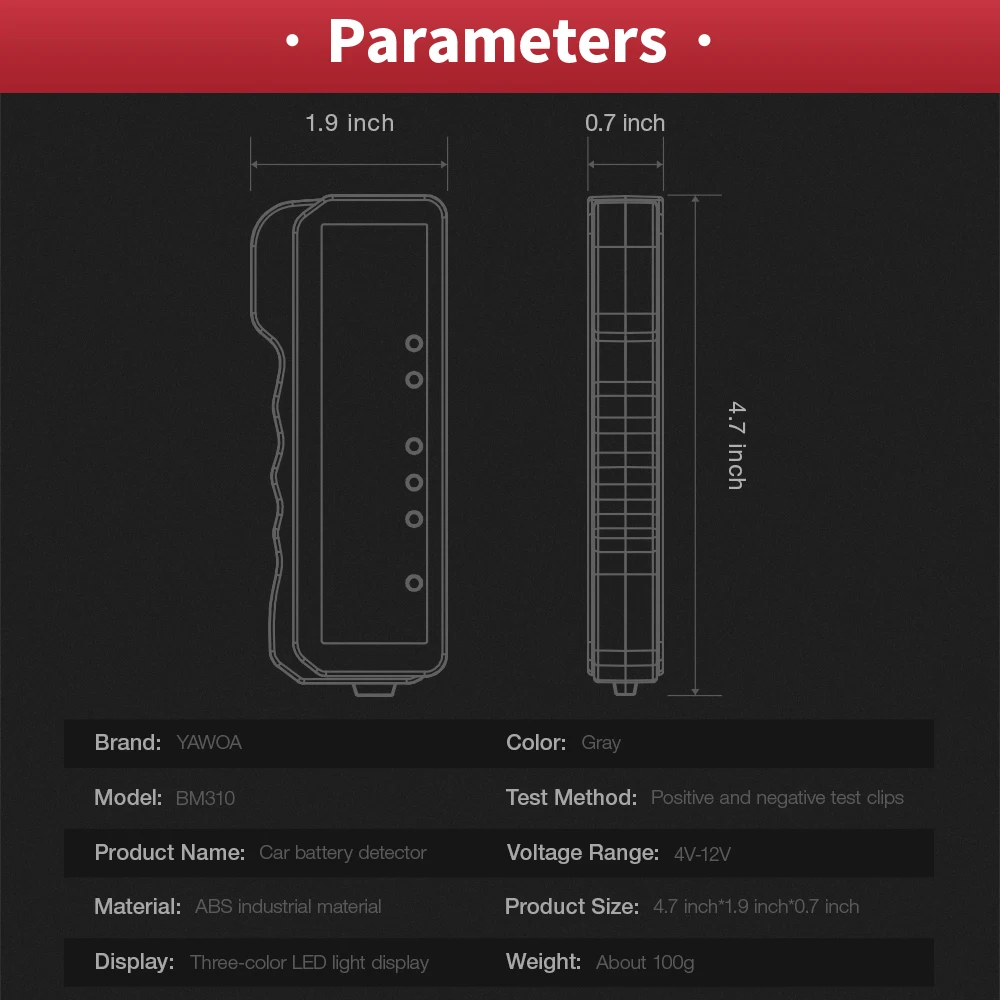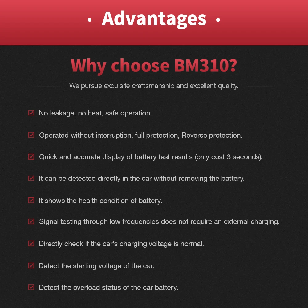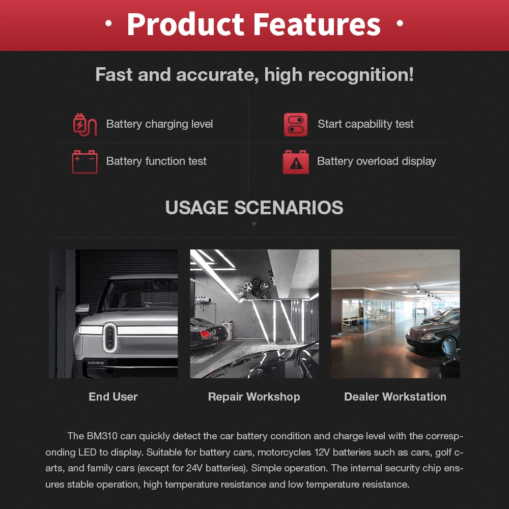 The BM310 can quickly detect the car battery condition and charge level with the corresp-onding LED to display. Suitable for battery cars, motorcycles 12V batteries such as cars, golf C-arts, and family cars (except for 24V batteries). Simple operation, The internal security chip ens-ures stable operation, high temperature resistance and low temperature resistance.