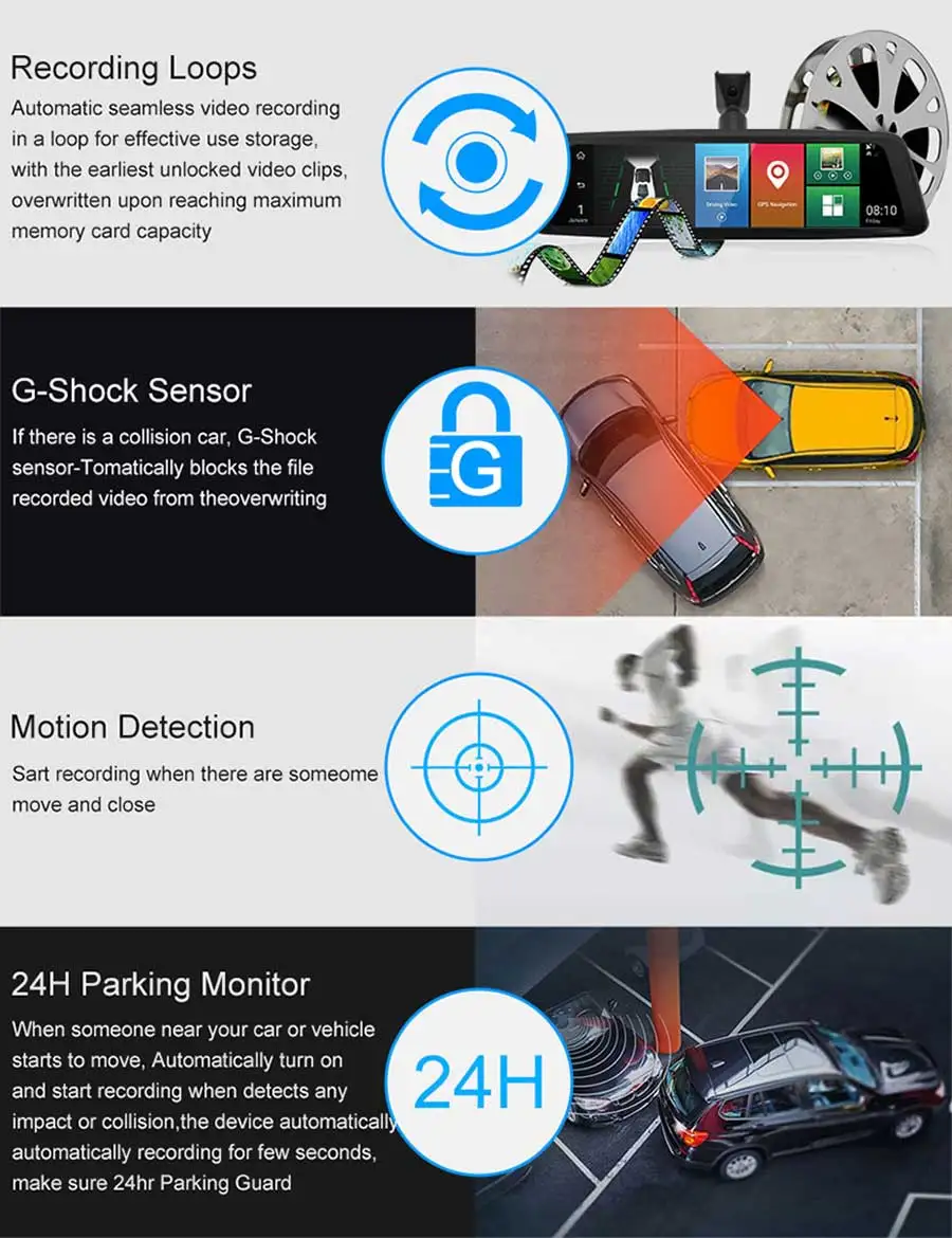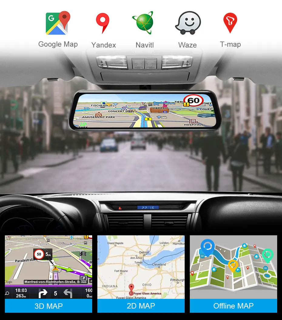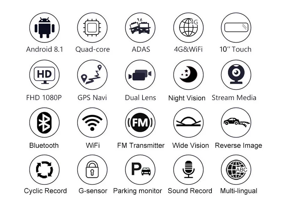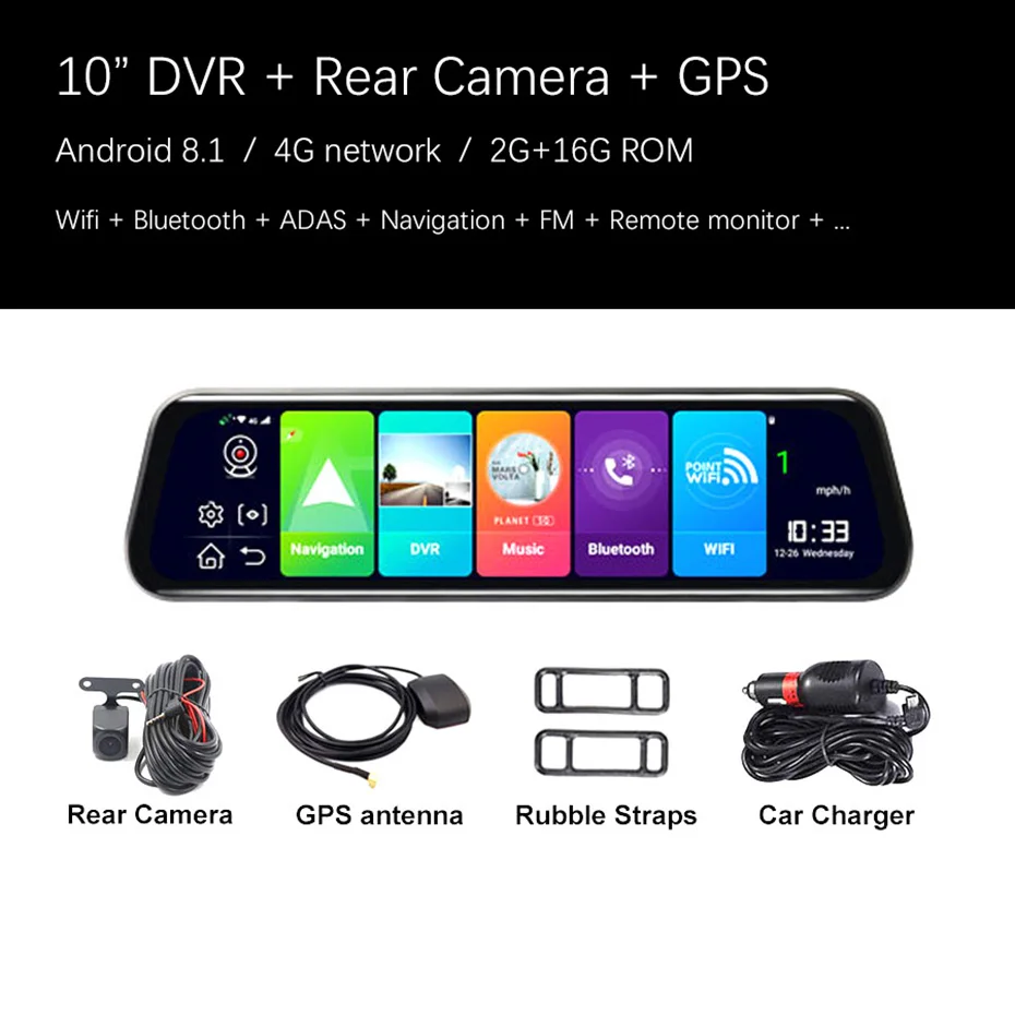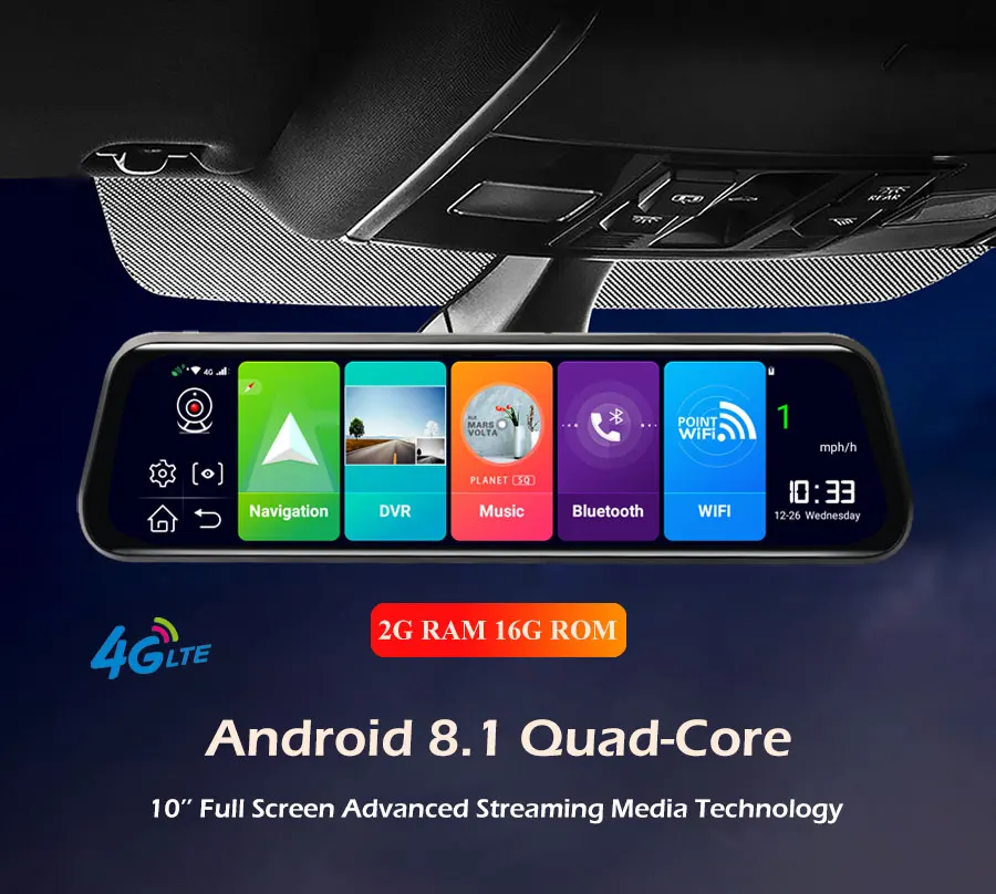 Это Android Stream Media Mirror DVR двойной объектив -10-дюймовый IPS сенсорный экран 2.5D, версия Android 8,1, 2G Ram + 16G Rom. -С навигацией GPS Wifi Bluetooth FM atc... Функции. -И поддерживает функцию удаленного монитора. -Также вы можете поместить в сетевую sim-карту 4G, затем вы можете заниматься онлайн-серфингом для фильмов и музыки.
