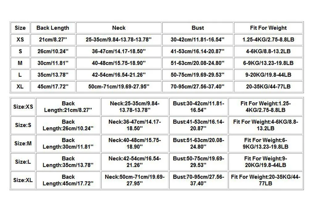 | Размеры | Задняя Длина | Шеи | Обхват груди | Подходит для Вес |