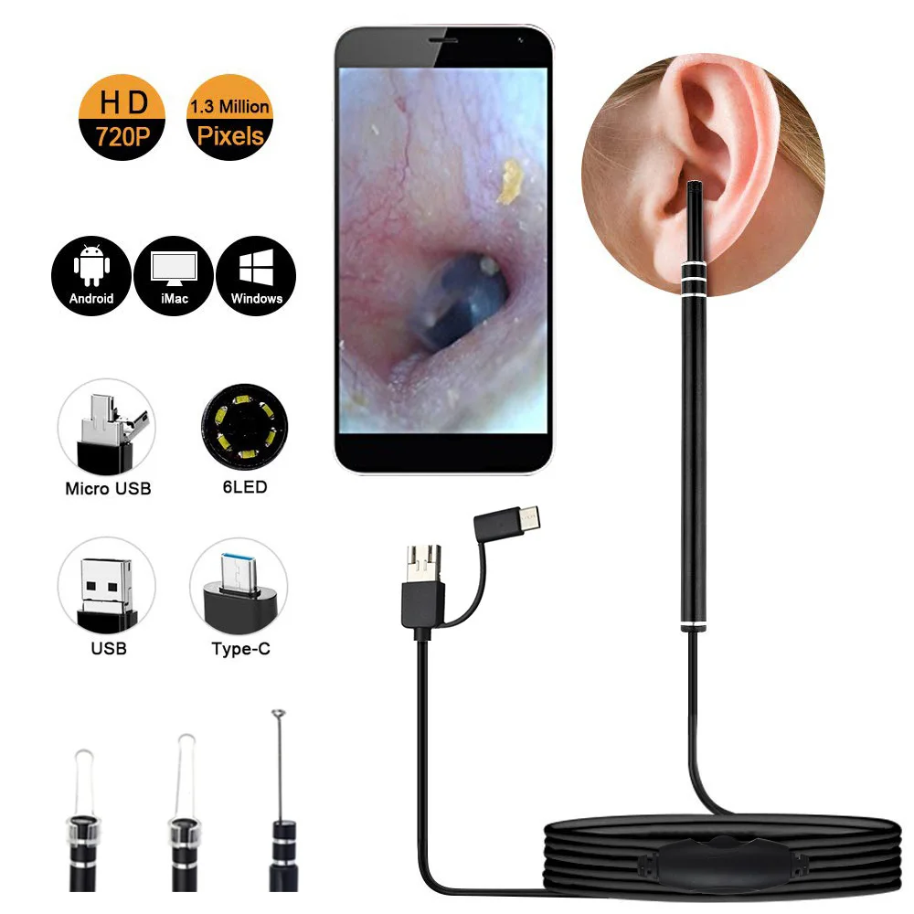 3 в 1 для чистки ушей эндоскоп Ложка Мини камера для снятия ушей Удаление воска для ушей визуальный нос для носа Otoscope Поддержка Android PC