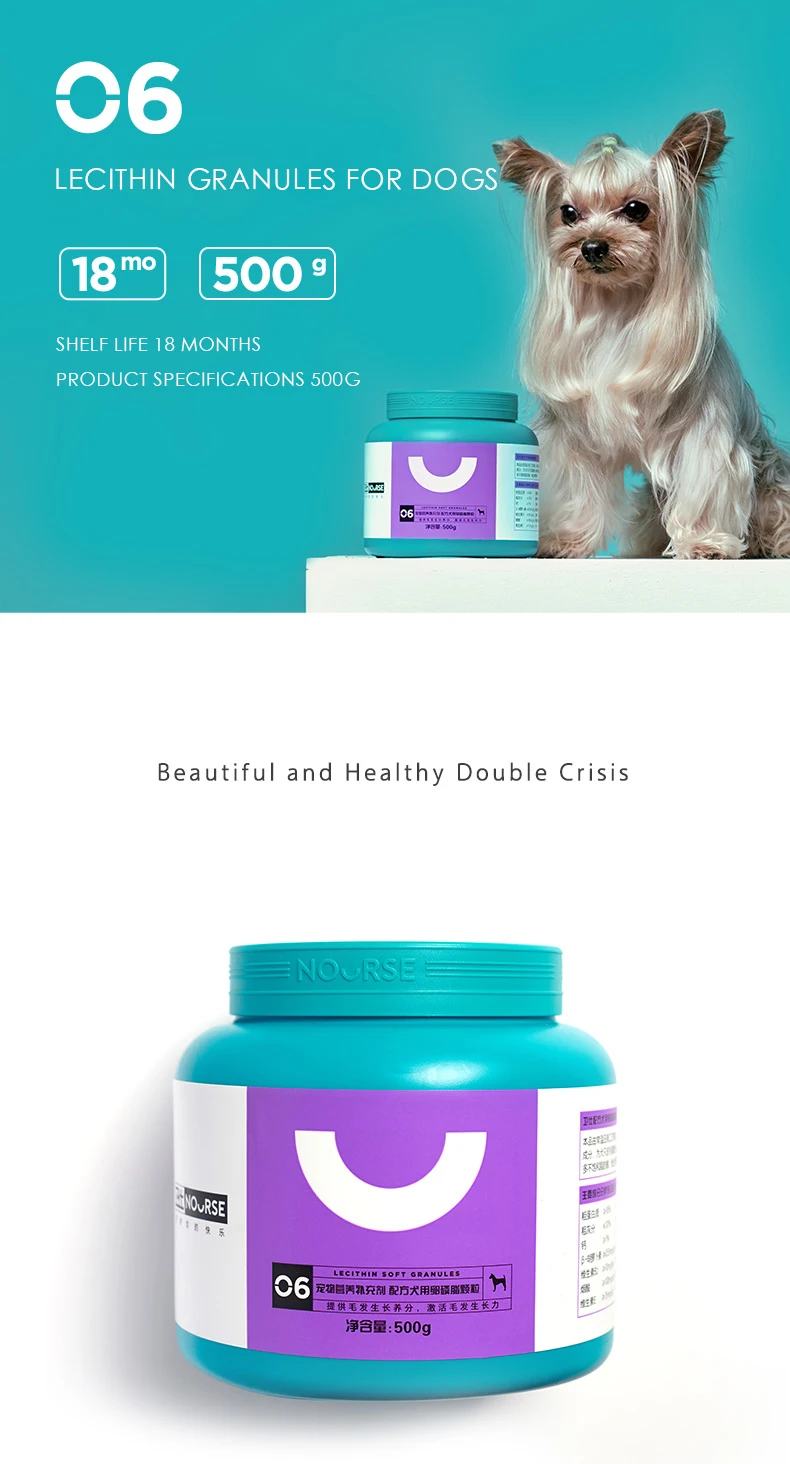 Lecithin granules for dogs Shelf life 18 months Product Specifications 500g Keep nature Concentrated natural soybean phospholipid essence, known as the third nutrient in parallel with protein and vitamins, after deoiling and defatting treatment, the phospholipid has higher purity and better absorption Retain nutrition The production uses low temperature direct pressure technology to avoid high temperature damage to nutrition Keep delicious Specially added chicken, mixed with natural fat fragrance, detonating the taste buds of the tongue, the soft texture conforms to the chewing habits of dogs Nourishes hair follicles Hair follicle keratin maintenance The reinforcement method is not easy to fall Activate the skin Adjust water-oil balance Nourishes the skin from the inside out Wake hair The inositol contained is the main nutrient for hair growth