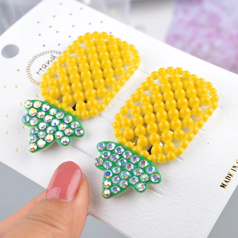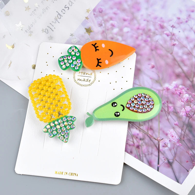 2 шт./компл., Детские милые заколки для волос с милыми рисунками из мультфильмов, милые детские аксессуары для волос с фруктами, безопасные заколки с кристаллами