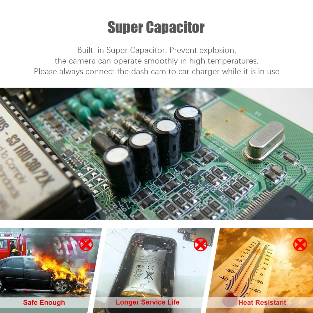 Встроенный супер конденсатор. Предотвращает взрыв, Камера может работать плавно при высоких температурах. Пожалуйста, всегда подключайте видеорегистратор к автомобильному зарядному устройству во время использования