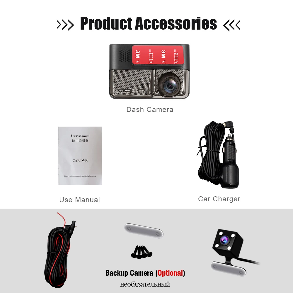 • 1 автомобильная камера • Крепление камеры-1 шт. • Автомобильное зарядное устройство-1 шт. • Руководство пользователя на английском языке-1 шт. • 1 задняя камера с кабелем (опционально)