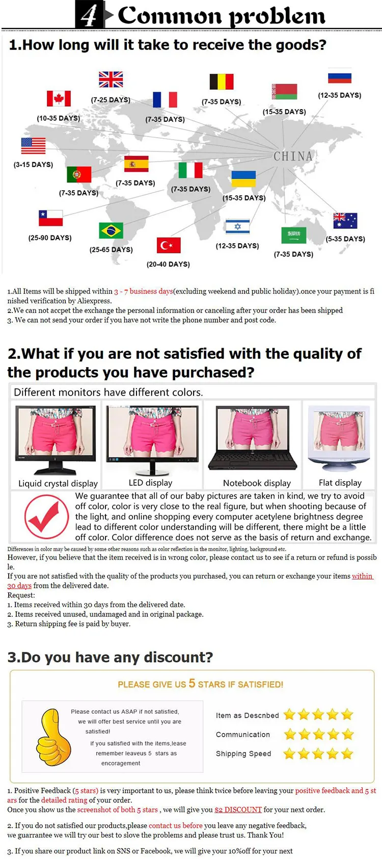 Q: Are the product photos real? A: Yes, All the photos displayed are 100% real. and photos are all taken by ourselves. But maybe there are some color shading because of monitors. Q: How do I pay for my purchase? A: we accept the following payment methods: credit card; money booker, T/T; western union. Q: When the delivery? A: we will send your orders in 1-7 days(according to your order's quantity )after the payment. But in case of any hot products are temporarily out of stock, we will contact you asap to ask an extension or change other items or any of your suggestion. Q: How much does it cost to ship to my country? A: Package less than 2kg will be shipped by China Post Airmail. the item you would like to purchase weighs more than 2kg.You can place the orders separately, making sure each order weighs less than 2kg, to take advantage of free shipping.You can either choose another express carrier, can ship the package via FedEx/DHL/UPS for your package! Q: Is there any tracking number for my item? A: Yes, China Post Registered Air Mail, we ship every order with their tracking number and you can view them! but, China Post Ordinary Small Packet Plus, it just can be tracked during in China. I mean it has no tracking information when it arrives in your country. But please do not worry about it. You will receive the package normally. If you are worried about your product will be lost in transit, I suggest you choose China Post Registered Air Mail Q: I am a reseller, I would like to buy many pieces of your item, What's the wholesale price? A: Thanks for your inquiry. if you would like to buy large quantity, please Contact us .we will give you the best price. thanks