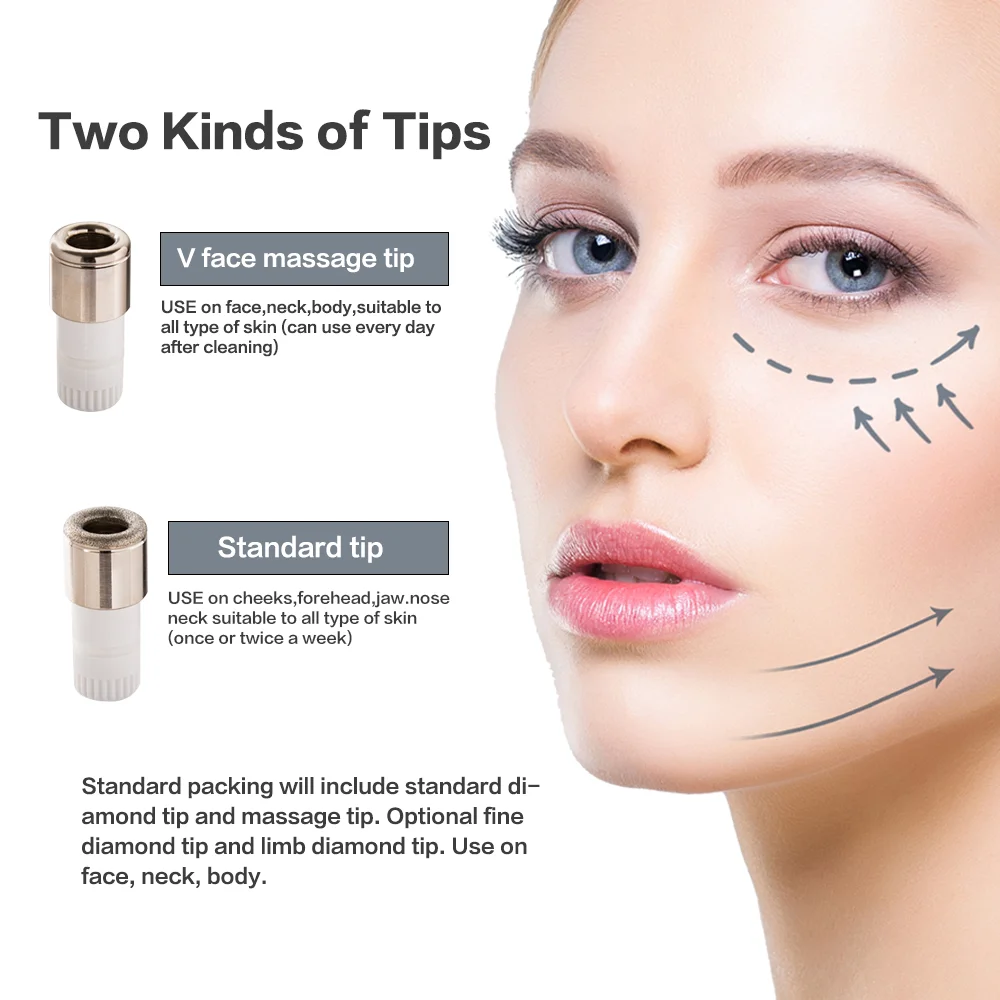 ①. Стандартный алмазный наконечник: подходит для всех типов кожи для удаления омертвевших клеток кожи и стимулирования роста клеток и кровообращения. Подходит для лица и шеи. (Один или два раза в неделю) ②. Лицевой массажный Наконечник: для массажа кожи и стимулирования кровообращения. Подходит для всех типов кожи (используется каждый день) ❤Регулярное использование будет очищать кожу, уменьшить тонкие морщины, улучшить цвет кожи, удалить следы от акне, сузить поры, проницаемость пор и эссенция впитывания.