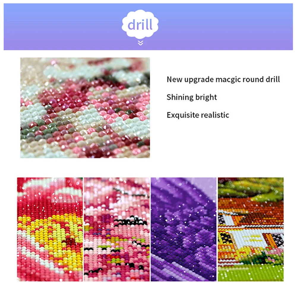 Содержимое упаковки: Водонепроницаемый холст, круглые алмазы из смолы, алмазная липкая ручка, клей для сверления, Алмазный лоток, сумка.