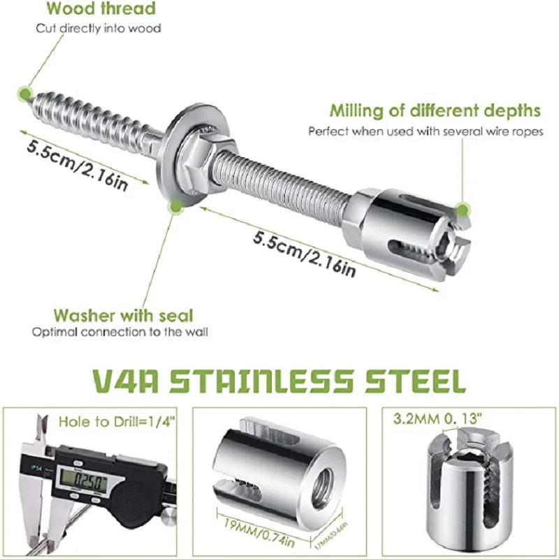 Набор содержит 8 настенных кронштейнов из нержавеющей стали (резьба по дереву/резьба M8), 8 подходящих универсальных дюбелей (Размер 10, например, для бетона, газобетона, твердого кирпича, известняк или твердый кирпич. Не подходит для теплоизоляционных композитных систем), 12 м трос из нержавеющей стали (3 мм, 7x7 нитей), 12 торцевых втулок из нержавеющей стали с защитой от коррозии и инструкции по сборке.