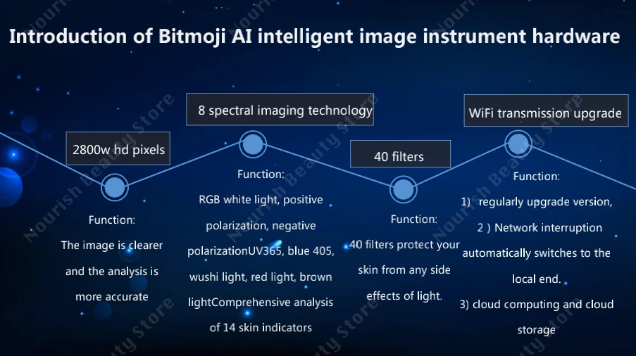 Через 28 миллионов hd пикселей для получения изображения кожи лица, используя 8 спектральную технологию визуализации, технологию распознавания лица AI, технологию глубокого обучения, технологию 3D моделирования, облачное хранилище облачных вычислений, патологические особенности кожи количественно анализируются на поверхности и глубоком слое, и могут быть обнаружены 14 показателей здоровья кожи. Всесторонне анализируйте и оценивайте проблемы с кожей, чтобы проводить научное и точное управление кожей на разумной основе!