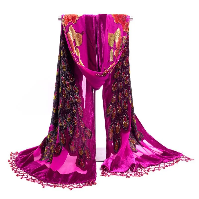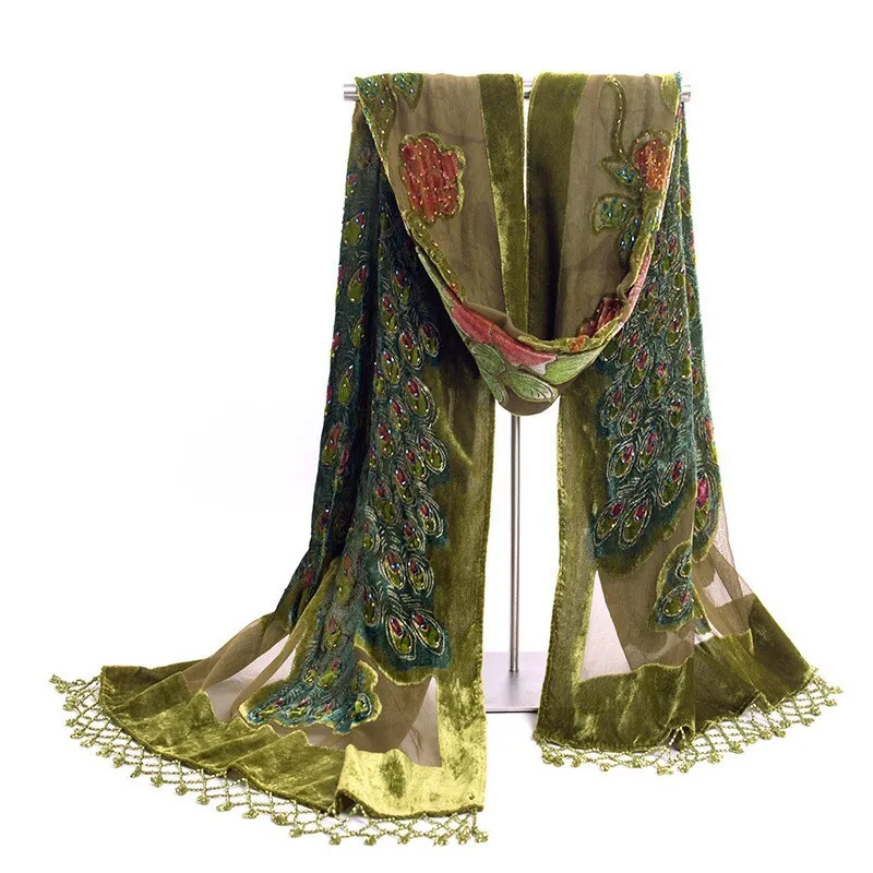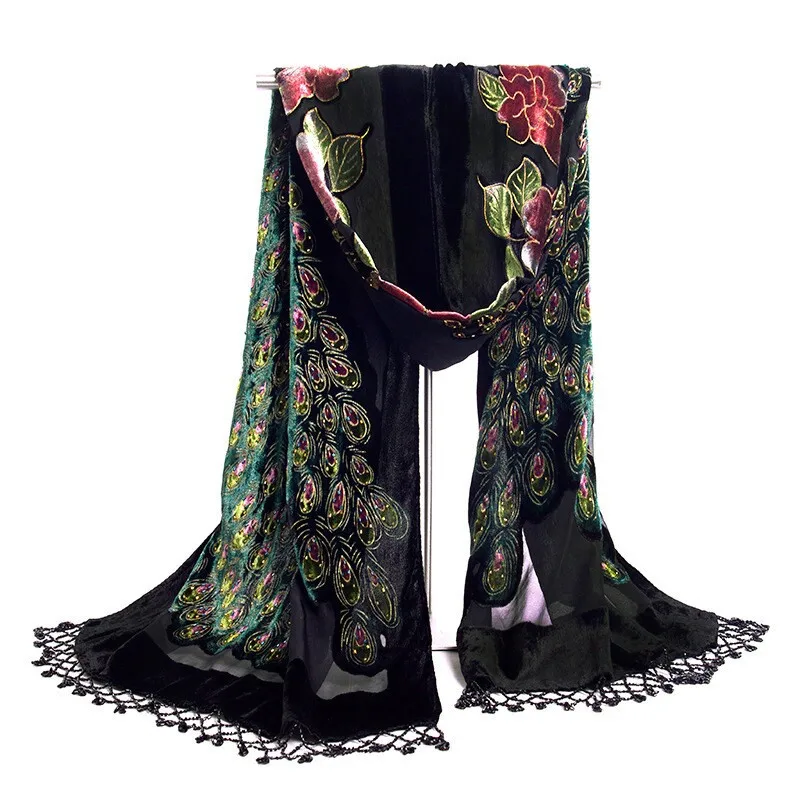 Модные китайские женские шелковые бархатные вышитые бисером шаль, шарф, шарфы, Цветы Павлин