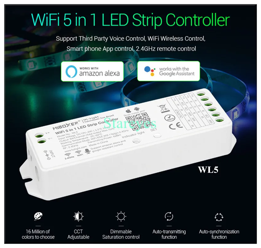 Совместимость: одноцветный, двойной белый (CCT), RGB, RGBW или RGBW 4 в 1, RGBCCT или 5 в 1 светодиодный