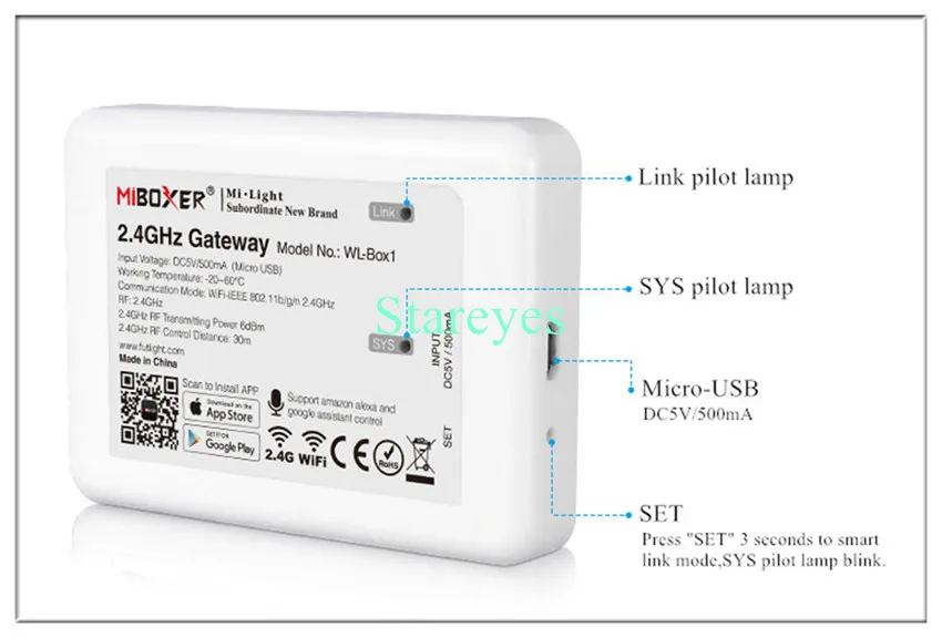 Наименование товара: Mi-светильник 2,4 ГГц 4 зоны сенсорный RF RGBW Пульт дистанционного управления УправлениеНомер модели: FUT096Напряжение: 3 в (2 * AAA батареи)Частота передачи: 2,4 ГГцМетод модуляции: GFSKМощность передачи: 6 дБмСтандартное энергопотребление: 20uAРасстояние управления: 30 метровРазмер: 120*52,5*21 ммКонтроллер соответствия: FUT037 и FUT038Наименование товара: Mi-светильник 2,4 г 4 зоны RGB + CCT Светодиодная лента контроллерНомер модели: FUT039Напряжение: DC12-24VЧастота передачи: 2,4 ГГцМетод модуляции: GFSKМаксимальный ток нагрузки на канал: макс. 6А/каналОбщая выходная мощность макс. 10AВходной порт питания: DC 5,5*2,1 гнездовой разъем или прямой 2 провода (+ -) входВыходное соединение: общий анодТелеуправление расстояние: 30 метровВстроенные программы: несколькоСовместимость: RGB, RGBW или RGBW 4 в 1 , RGBCCT или 5 в 1 светодиодныйРазмер: 85*45*23 ммСоответствующий пульт дистанционного управления: FUT092Наименование товара: Mi-светильник 2,4 ГГц 4 зоны RGB + CCT пульт дистанционного управления УправлениеНомер модели: FUT092Напряжение: 3 в (2 * AAA батареи)Частота передачи: 2,4 ГГцМетод модуляции: GFSKМощность передачи: 6 дБмСтандартное энергопотребление: 20uAРасстояние управления: 30 метровРазмер: 138*56*38 ммКонтроллер соответствия: FUT039Название продукта: светодиодный контроллер Mi-светильник с 8 зонами 5 в 1Номер модели: WL5Рабочая температура: -20 -60 ℃Рабочее напряжение: DC12 ~ 24 ВВыходной ток: 6А/каналОбщая мощность: Макс. 15аРежим связи: Wi-Fi-IEEE 802.11b/g/n 2,4 ГГц или 2,4G RFРасстояние управления: 30 метровСовместимость: одноцветный, двойной белый (CCT),RGB, RGBW или RGBW 4 в 1, RGBCCT или 5 в 1 светодиодныйВстроенная Голосовая система: Amazon alexa, Google AssistantРазмер: 142*38*23 ммСоответствующий пульт дистанционного управления: FUT089, приложение для смартфонаНазвание продукта: пульт дистанционного управления Mi-светильник с 8 зонамиНомер модели: FUT089Рабочая температура: -20 -60 ℃Напряжение: 3 в (2 * AAA батареи)Частота передачи: 2400-2483,5 МГцМетод модуляции: GFSKМощность передачи: 6 дБмРасстояние управления: 30 метровМощность в режиме ожидания: 15uAРазмер: 153*47*19 ммСоответствующий контроллер: WL5Наименование товара: Mi-светильник 2,4 ГГц шлюзНомер модели: WL-Box1Режим подключения: Wi-Fi-IEEE 802.11b/g/n 2,4 ГГцМощность: 6 дБмRF: 2,4 ГГцОсобенности: 2,4 ГГц шлюз контроллер Wi-FiВход: DC5V/500mA (Micro USB)Рабочая температура: -20 ~ 60 °CСвязь: Wi-Fi-IEEE 802.11b/g/n 2,4 ГГцКомплект контроллера: Mi светильник 2,4 GHz RF продукты